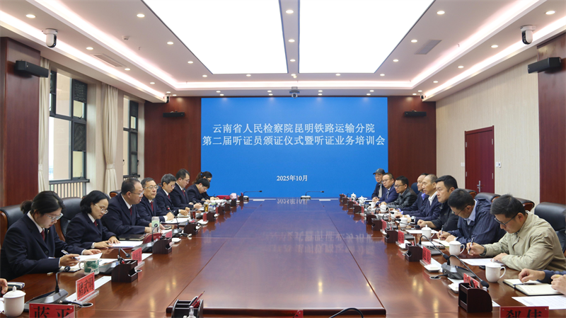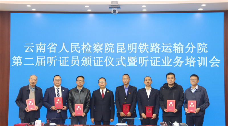 10月28日上午,云南省人民检察院昆明铁路运输分院(以下简称昆明铁检分院)举行第二届听证员颁证仪式暨听证业务培训会。来自社会各界、不同行业的13名专业人士作为听证员代表接过红彤彤的聘书,被聘任为新一届听证员,正式“持证上岗”,成为新一届“智囊团”。