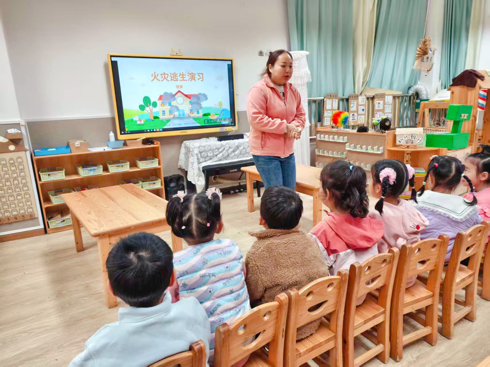 (图片1说明:教师正通过卡通图片向孩子们讲解消防知识。)