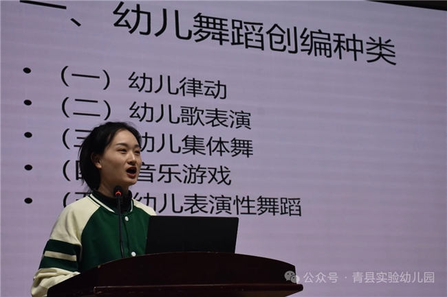幼儿舞蹈创编板块里,赵静老师明确律动、歌表演、集体舞等创编种类,提出“动作—舞句—舞段”的渐进式创编逻辑,指导教师从儿童生活场景与影视文学作品中汲取造型灵感,通过原型模仿美化、优秀作品剖析积累素材。现场组织教师分组创编《蝴蝶花》《小毛驴》等舞蹈,并共同完成成品舞蹈《虫儿飞》的编排与表演,提升教师艺术教学实操能力。