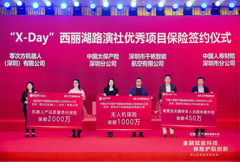 活动现场,南山区金融发展服务中心联合8家头部险企成立“南山科技保险共同服务体”,中心主任李雪松与各保险机构代表进行签约,推动政险合作实质落地。“共服体”首批为“X-Day”西丽湖路演社5家科技企业定制“一企一策”专属保障,覆盖机器人、低空经济、芯片研发等赛道,产品包括机器人责任险、无人机保险、科惠保等,总保额达7500万元。