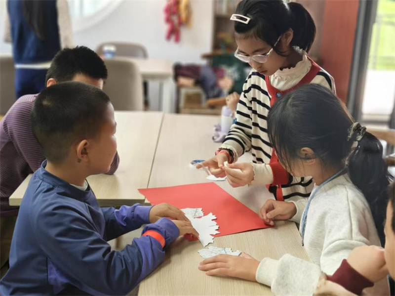 手工DIY环节尽显巧思,孩子们专注地用彩珠穿制“和合手链”,指尖翻飞间,红、黄、蓝等各色珠子绽放光彩。“我要把这条手链送给妈妈,还要给她读今天学到的‘亲仁善邻,国之宝也’的句子。”刚完成作品的陈雨桐举着手链,分享自己的收获。不少孩子还在手链上搭配了小巧的书本造型挂饰,寓意“文化相伴、阅读同行”。