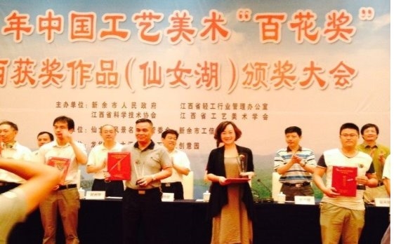 张春浪(右一)参加中国工艺美术百花奖获银奖(受访者供图)