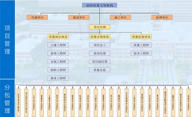 项目坚持策划先行,样板引路,过程管控,一次成优的管理理念。在组织架构上,成立以项目经理为第一负责人的质量决策、监督、保证三大体系,明确分区质量管理责任制,落实全员履职考核,通过月度质量例会、项目经理讲质量等活动,形成“层层负责、人人有责、各负其责”的管理格局。