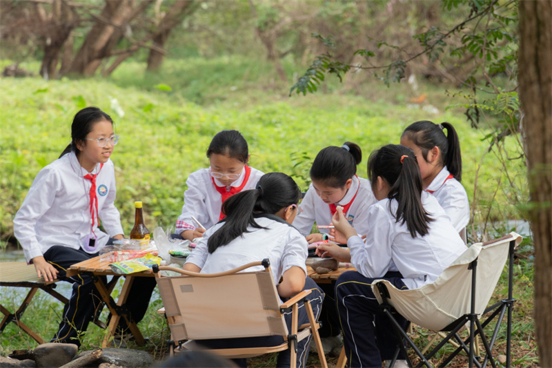 当天清晨,溪滩边已是一片欢声笑语。同学们身着整齐校服,佩戴鲜艳红领巾,在指定区域有序签到后,快速组建为水饺组、水果捞组和烧烤组。在家长的协助下,各小组有序领取食材与物资,野炊活动正式拉开序幕。