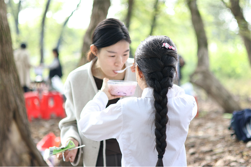 午餐过后,同学们在老师和家长的带领下开展了“两人三足”“丢手绢”“自然寻宝”等户外游戏。孩子们在奔跑与欢笑中感受秋日的惬意与美好,也在协作与互动中增进了彼此的情谊。学生黄予希说:“和爸爸妈妈一起玩游戏太开心了!我还学会了和同学分工合作,知道了分享的快乐,这是我难忘的一次户外体验。”