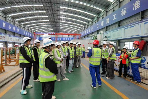 在环氧钢筋加工车间,师生们观摩了从抛丸除锈到智能加工的全自动生产线,该线日均产能达130吨,并通过尼龙护板等细节设计,保障涂层“零损伤”。而在大体积混凝土防裂环节,项目通过优化配合比、智能温控与循环水冷技术,实现对构件内部温度的精准控制,从源头保障墩台百年寿命。