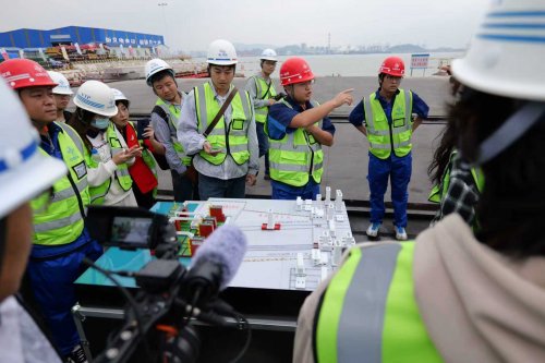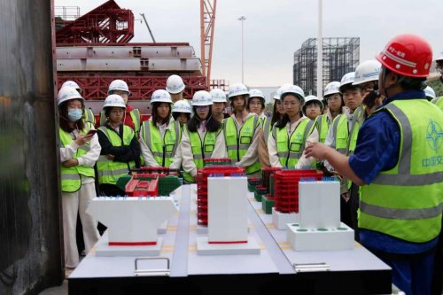 在出运码头,师生们了解了墩台通过顶运一体台车系统,沿轨道精准横纵移、经1:10斜坡道平稳溜放、最终装船出运的全流程。项目依托两个出运平台和三组大型半潜驳船组,构建起高效协同的墩台出海通道。通过智能检测系统对构件溜放与航行过程进行实时稳定性监测,并结合低重心转运平台设计,全面保障了187个墩台在复杂海况下的安全出运。