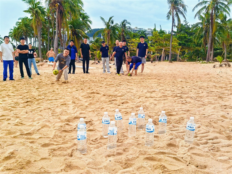 周末清晨,海风带着淡淡的咸湿气息轻拂而来,潮水正缓缓退去,将一片辽阔的沙滩与礁石滩展露在众人眼前。礁石的缝隙间、湿润的沙粒下,藏匿着无数鲜活的小生命,这些窸窸窣窣的动静,勾勒出大海的生机与活力。经验丰富的老员工代东生眼睛一亮,拍着手提议道:“咱们就地取材玩个团建游戏吧!用掉落的椰子当保龄球,矿泉水瓶做球瓶,既有趣又能热热身!”这个新奇的想法瞬间点燃了大家的兴致,众人纷纷围拢过来,你一言我一语地讨论规则:“得找平坦点的地方,不然椰子滚歪了不算数。”“每组派三个人轮流击球,击倒数量多的赢。”“输的组一会儿赶海得多帮赢的组捡两个海鲜!”