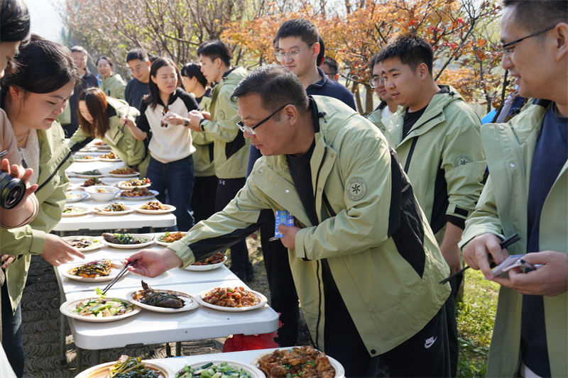 健步走结束后,土灶厨艺大赛火热开赛。17支参赛队伍需在30分钟内完成三道指定菜式,各组队员分工明确、默契配合:掌勺的师傅紧盯火候,颠勺翻炒间火光四溅,热油滋滋作响;切配的队员早已备好姜丝、葱段、蒜末等配料;烧火的队员屏息调控柴火,确保锅底温度恰到好处。青菜炒蘑菇要突出清爽鲜甜,小炒鸡需炒出紧实嫩香,葱烧鲫鱼得焖出咸鲜入味,选手们循着菜品要求各展绝活,有的专注调味,有的细心摆盘,土灶烟火气中夹杂着阵阵鲜香,弥漫在整个营地。大家秉持勤俭节约理念,食材物尽其用,不浪费一丝一毫,用朴实厨艺诠释廉洁作风。裴烨行长更是亲自露了一手,娴熟地为大家烹制了一道色香味俱全的“韭黄炒鳝丝”,精湛的厨艺赢得了现场员工的阵阵掌声与一致好评,瞬间点燃了全场热情。由行领导及工会随机抽取的员工代表组成的评委团,逐组品鉴打分,从食材处理、口感风味、品相造型到节约程度逐一考评,现场点评专业中肯,让这场竞技既充满比拼的紧张感,又不失交流的温度。