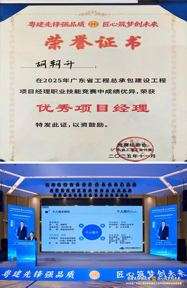 近日,中国化学南投江西公司宁都项目部党支部书记、项目经理胡朝升在广东省总工会、人力资源和社会保障厅、工业和信息化厅、科学技术厅联合主办的“粤建先锋强品质、匠心筑梦创未来”2025年广东省工程总承包(EPC)建设工程项目经理职业技能竞赛决赛上,与中建二局、中建三局、中铁六局、中铁建工、上海宝冶集团等重点工程的60名项目经理同台竞技,荣获“优秀项目经理”殊荣,充分展现了公司项目经理队伍一流的职业水准和昂扬的精神风貌。