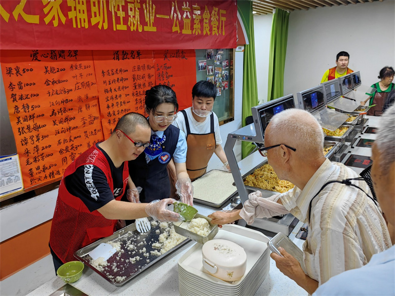 每天中午11点开始,中央门街道新模范马路9号的社区食堂都格外热闹,这里饭菜飘香,人流不断,不少老人甚至专门坐公交车每天来“打卡”。吸引老人们的不光是可口实惠的饭菜,更是餐厅里来自建行南京分行志愿者与一群大龄心智障碍者给予的温情陪伴。三年多的时间里,这家由建行南京分行支持建立的“公益素食餐厅”不仅累计为社区高龄老人、残疾人等18万人次提供公益午餐,更成为探索“大龄心智障碍”青年走出家门、融入社会的实验田。