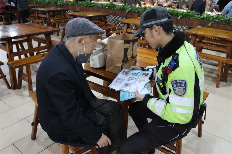 这边互动摊位人气高涨,食堂内的“席间宣传”同样贴心。银菊社区工作人员与城东中队交警化身“流动宣传员”,穿梭在各个餐桌之间,既不打扰居民用餐,又能近距离传递安全提示。
