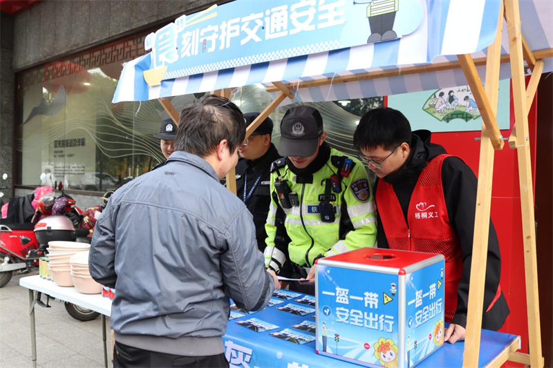 “师傅,您知道给电动自行车加装遮阳棚、雨棚算不算违规?答对就能领奖品!”2025年12月2日是第十四个全国交通安全日,当天中午桐乡市梧桐街道世贸二期人民大食堂的入口处格外热闹。梧桐街道银菊社区联合桐乡市公安局交通管理大队城东中队,紧扣“文明交通、礼行天下”的全国交通安全日主题,把交通安全宣传搬进充满烟火气的饭堂,用居民喜闻乐见的互动问答形式,让安全知识顺着饭菜香“走进”大家心里。