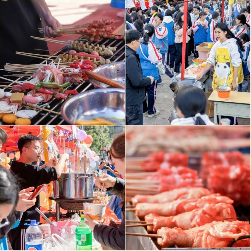 与竞技赛场的热血相伴,校园美食节同步上演“舌尖上的精彩”。各班级在指定区域精心布置摊位,饺子、烧烤、炸串、炒饭、奶茶、蛋糕等特色美食琳琅满目,创意十足的摊位海报吸引着师生驻足。从食材采购、清洗加工到现场售卖、账目核算,同学们分工协作、全程自主参与,在实践中锻炼动手能力与组织协调能力。“通过这次美食节活动,我学到了很多劳动知识,不仅增强了动手能力,还提升了团队凝聚力,真切感受到校园生活的乐趣。”高二学生向炳权的分享,道出了美食节的育人价值。烟火气十足的美食街,不仅让师生们品尝到美味佳肴,更让劳动教育落地生根,成为校园里一道温暖的风景线。
