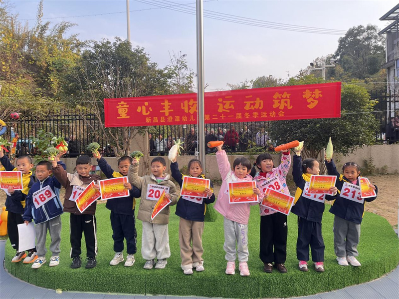 金风送果满庭芳,小娃运动斗志扬。12月3日,浙江省新昌县澄潭幼儿园第二十一届冬季运动会在暖阳中拉开帷幕,以“童心丰收·运动筑梦”为主题,将丰收元素与体育竞技巧妙融合,让孩子们在奔跑跳跃中体验运动快乐,在协作比拼中收获成长力量,上演了一场充满童趣与温情的运动盛会。