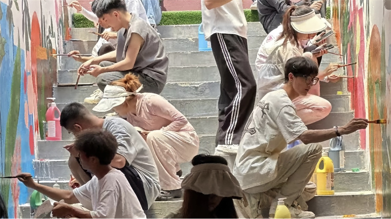 (图为学院绘画、视觉传达专业学子参加惠水县文星双语学校公益墙绘活动)