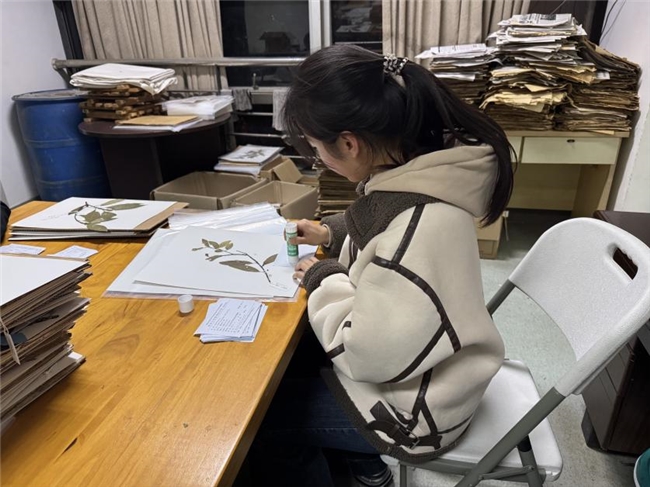 生物标本馆植物展区收藏了丰富的植物标本,是学校重要的教学与科普基地。在指导老师的带领下,同学们分组协作,对部分植物标本进行归类整理、除尘维护及标签核对。任梅琳与同学们仔细观察各类植物的形态特征,并探讨其分类、生态习性及其在水体周边环境中的作用。