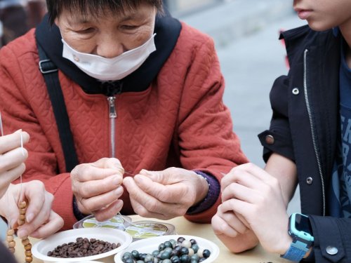 除闲置循环板块外,市集内的手工创意区域同样人气高涨,吸引居民积极参与实践。在垃圾分类志愿者现场指导下,居民将生活中常见的易腐垃圾转化为精美的手工艺品,利用咖啡店废弃的咖啡豆制作成兼具质感与特色的手串。在动手实践过程中,居民不仅直观认识到“垃圾并非无用之物”,也更深刻理解“垃圾分类是资源化利用的前提”,从而在创作中深化对低碳减量现实意义的认识。