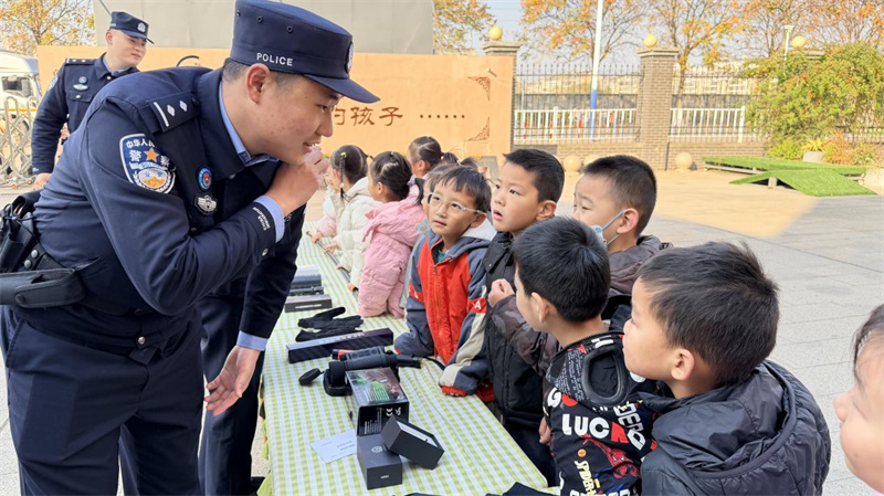 活动紧扣幼儿认知特点与教职工岗位需求,分场景、分群体精准施策,实现教育实效最大化。在幼儿专属体验环节,边检民警化身“安全启蒙导师”,带着盾牌、警棍、对讲机等警用装备走进校园,通过“实物展示+趣味讲解+互动触摸”的形式,生动介绍各类装备的功能用途与执法场景。孩子们在近距离观察、亲手触摸中,直观感受法治力量与警察职业的神圣,在心中播下“敬畏规则、热爱祖国”的种子,让爱国主义情怀与法治启蒙教育在趣味互动中自然浸润。