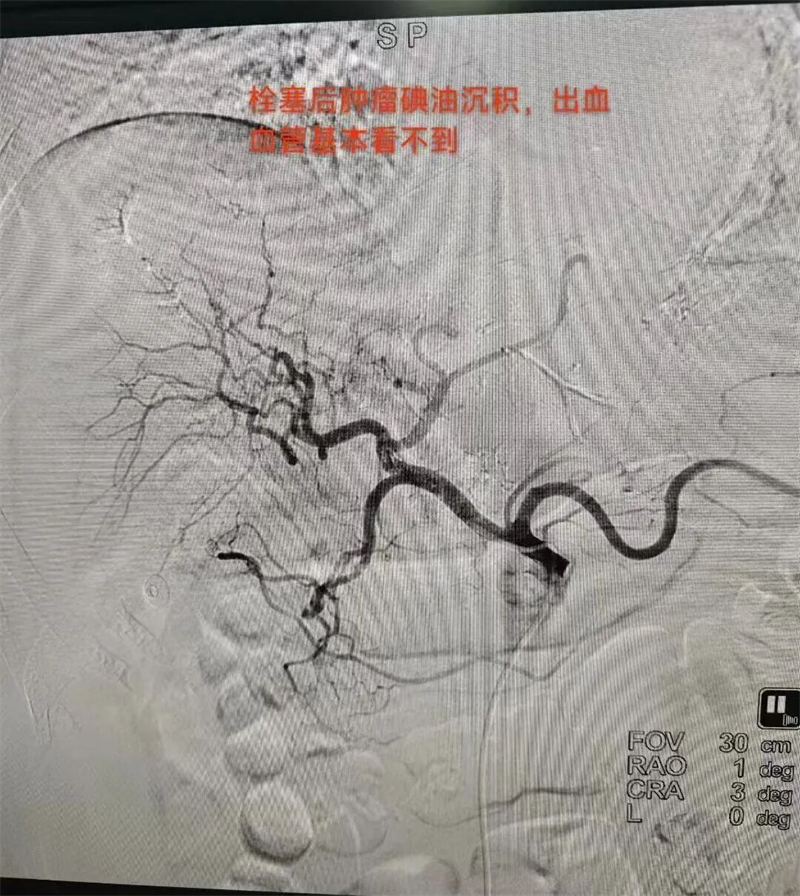 在DSA血管影像引导下,精准找出了出血元凶——肿瘤破裂出血。栓塞后,造影显示肿瘤碘油沉积,出血血管基本看不到,手术达到预期效果。经多学科医护团队后续科学救治及精心护理,患者目前生命体征较平稳,已转出ICU,至普通病房接受后续治疗。