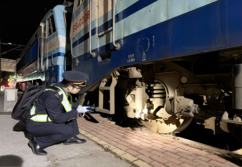 出乘前的准备工作就绪,杨浪和搭档走向整备场。轨道在灯光下延伸向远方,金属构架的整备棚与整齐的绿植在冷风中静静伫立,一台台机车整装待发。5时20分,杨浪来到SS8-208机车旁,开启了出勤前的机车检查工作。从走行部每一处部件的衔接,到车钩的灵活度、制动装置的灵敏度,再到减震装置的安装牢固度,他弯腰俯身、逐点排查,只见手电的光束在机车各个部位来回穿梭。