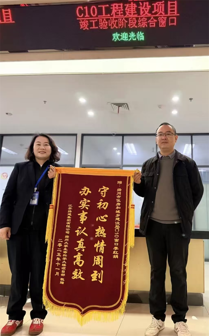 扬州大学生命科学大楼项目部相关负责人赠送的锦旗(扬州市住房和城乡建设局供图)