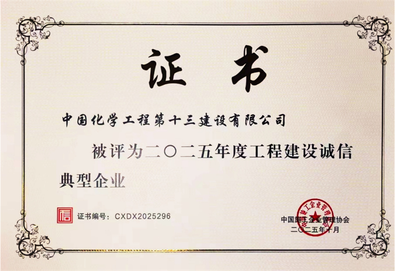 近日,经中国施工企业管理协会评审,中国化学工程十三化建顺利通过“工程建设诚信典型企业”复核,连续四年获评该项荣誉,同时继续保留AAA级企业信用等级,获评23星信用评级,以优异表现彰显了企业的良好信誉与综合竞争力。