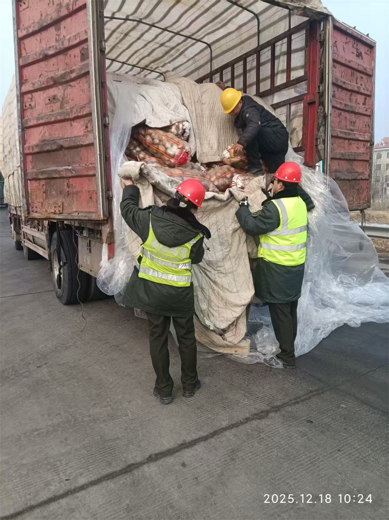 经过近半小时的忙碌,滚落的土豆全部归仓,保温棉被也固定妥当。司机师傅连声道谢:“真是太谢谢你们了,不然我这一车菜不仅要损失,还得耽误交货!”高鸿继笑着回应:“这都是我们该做的,您赶紧准备查验,别耽误了运输。”随后,两人快速协助司机完成查验流程,看着货车顺利驶离收费站,他们才返回工作岗位。