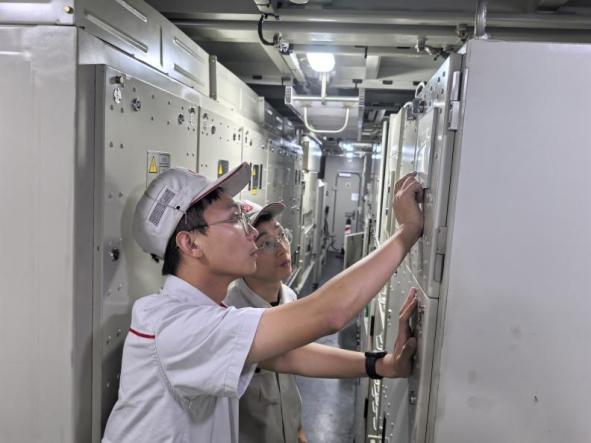 走进该段高压调试库,设备运转的轰鸣声不绝于耳。试验人员肖贤和高星正操作着直供电试验小车,将其与机车的供电插座精准对接。他们严格按标作业,依次对机车的四个供电插座及列供柜两路独立电路进行负载及接地试验检测,确保列供装置的性能试验良好。“列供负载试验是高压试验的重要试验项点,必须仔细核对车上和车下电压、电流等核心参数,确保系统在负荷波动下‘稳得住’,切实达成风险可控、性能可验、质量可溯的验收标准。”试验人员肖贤。