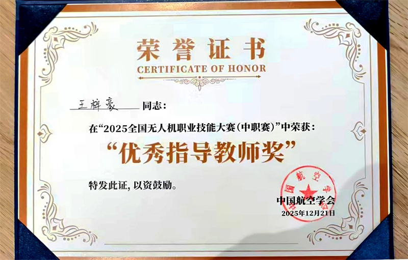 佳绩的取得离不开教师的悉心栽培与无私付出。王梓豪老师深耕无人机专业教学一线,聚焦赛项要点与技术难点,全程陪伴学子打磨技能、破解难题,以专业的指导与高度的责任心为参赛团队保驾护航,获评优秀指导教师奖。