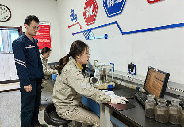 早上8点,班组成员全部到岗,王彩霞组织班前会,分配当天的化验任务和日计划,班组成员罗云涛、张文锦、高云洁换好防静电服,一边听一边在自己的小本子上记清今天的工作任务和注意事项,8:10大家各自领完自己的工作任务便开始进入化验室开启化验设备、准备当天化验工器具,一天的工作在随着设备开机的“滴、滴”声中开始,检查量热仪水箱水温、开启马弗炉升温、准备称量的坩埚、称量当天使用的标煤……一天工作有序展开。