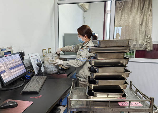 下午入厂煤样的化验工作紧张有序的开展着,由于班组女工产假休假人员较多,人员短缺,进入供热期后,矿点数量增加、来源多样,导致入厂样品检验数量大幅攀升,下午的化验工作量更是繁。“呀,我的全水分干燥时间到了”,正在称量全硫的高云洁喊道,抓紧把当前的样称量完毕后,一路小跑去全水室从干燥箱中取出全水样品进行称量,今天的入厂全水样10个,使用了20个称量盘,每个盘和样重约900g左右,她在20个盘前认真地逐一称量,确保煤样质量、样重无误再上传,杜绝发生报警,整个下午,大家都在各个化验室间不停的穿梭,忙碌而又有序的开展这各项化验任务。