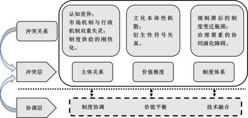 本文从“主体关系—价值维度—制度供给”三个层面解构冲突机制(图1)。主体关系冲突表现为传承伦理与市场效率的认知断裂、集体权益与个体诉求的利益博弈、行政干预与市场调节的治理失衡;价值维度冲突聚焦在文化本体耗散与衍生符号失真的双向异化;制度供给冲突则体现为规制体系滞后与治理效能衰减的制度瓶颈。三者构成嵌套式矛盾网络:主体行为偏差引发价值目标偏移,价值目标偏移加剧制度供给失衡,而制度缺陷又反向强化主体矛盾。这种系统性冲突的生成与演化,本质是非遗创新生态系统在文化基因存续与市场价值创造间寻求动态均衡的必然过程。
