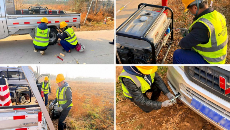 演练现场,各应急小组迅速响应、协同作战。在基础场景处置环节,救援小组反应敏捷、方案科学,仅用15分钟便完成受困车辆拖拽救援,高效清除通行障碍;保障人员操作规范熟练,快速完成基站应急发电设备的架设与调试,顺利恢复基站供电;工作人员严格遵循操作流程,规范完成车辆防滑链拆装作业,保障应急车辆雨雪路面通行安全。