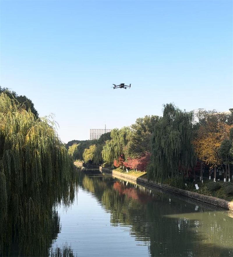 行动中,翠苑中队操作无人机对余杭塘桥至庆隆桥河段进行了全方位空中巡查。无人机凭借其高空视野优势,高效巡查水面漂浮物、隐蔽角落垃圾堆积及沿岸设施状况,实时画面同步传回地面队员,为快速发现处置问题提供了有力技术支持。这种“天空之眼”与传统步巡相结合的模式,大幅提升了巡查的覆盖范围与效率。