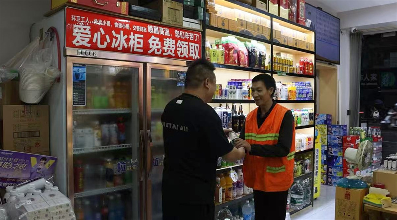 薛洋的服务心思,远不止于此。夏季设置“爱心冰柜”为环卫工人送清凉,常年开设“助农专柜”帮村民拓展销路,茶余饭后还化身“政策宣讲员”,耐心为老人讲解医保缴费……