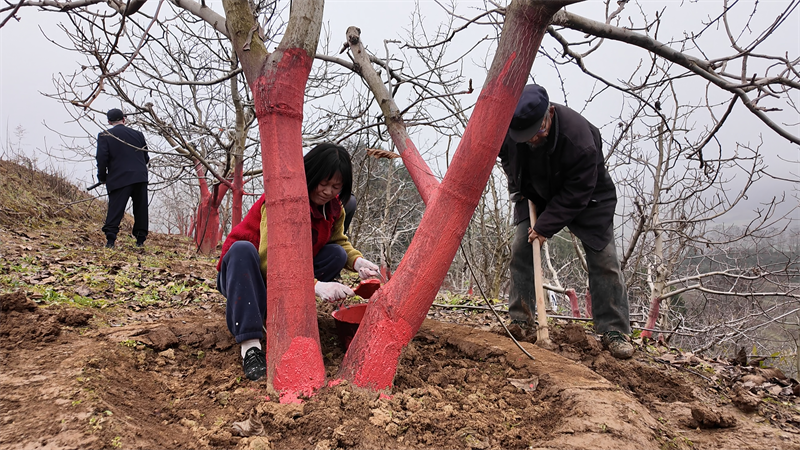 群众正在对核桃树进行冬季管护。刘镇摄
