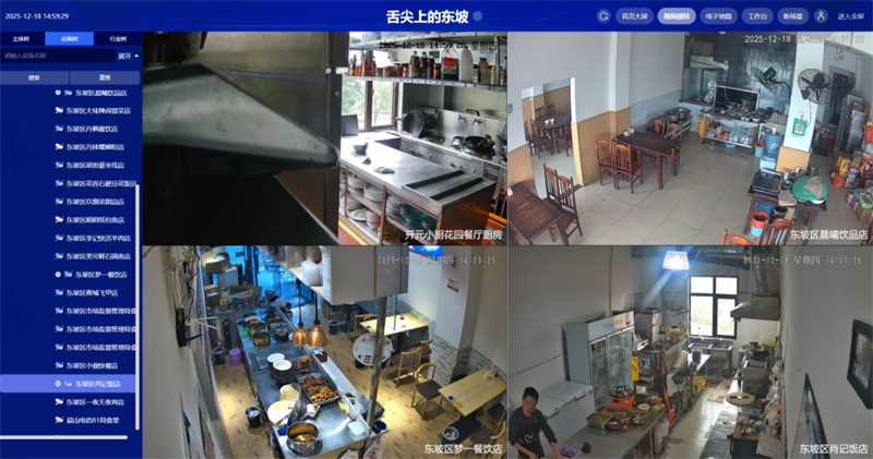步入眉山市市场监管局的智慧食安驾驶舱,全市重点餐饮单位的实时动态尽收眼底。系统可自动辨识未戴口罩、违规吸烟、鼠患等十余类风险,预警信息瞬间直达商家与监管终端,实现“全域监管一屏统览”。“以往跨区巡查耗时费力,如今依托平台,足不出户即可完成非现场监管,几分钟内响应处置,效率不可同日而语。”市市场监管局相关负责人介绍。目前,全市学校食堂、大型餐饮“互联网+明厨亮灶”覆盖率已超95%,乡镇接入率稳步提升,正逐步实现从“事后处置”到“事前预防”的治理范式转型。