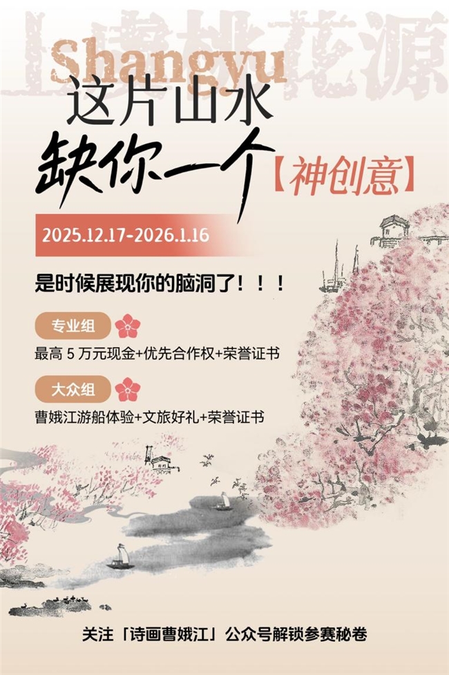 征集通道尚未关闭,即日起至2026年1月16日,关注“诗画曹娥江”微信公众号,回复关键词“桃花源景区运营创意大赛”,即可获取完整资料包与参赛指南。