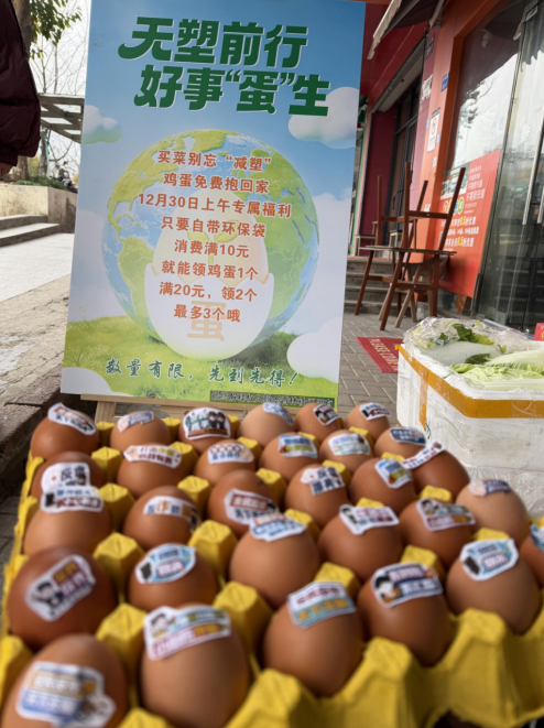 为提升居民环保袋使用率,减少节日期间塑料袋消耗。增强公众环保意识,推动绿色生活方式常态化。在新的一年来临之际,西湖区留下街道翰墨香林社区与辖区蔬菜店协作,组织开展了“自带环保袋买菜送鸡蛋”公益活动,居民自带环保型购物袋/篮,来蔬菜店购买菜品,可根据消费金额免费领取鸡蛋。