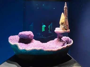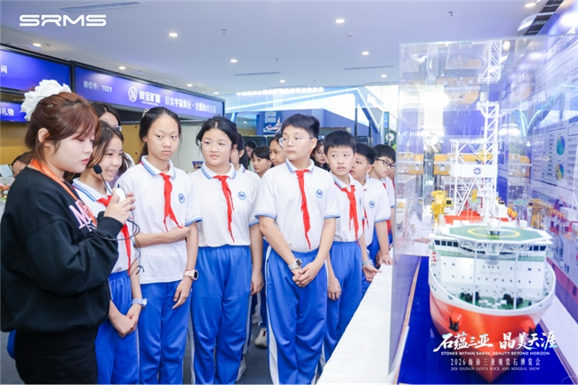 一方灵璧石以“瘦、皱、漏、透”的宋韵古意静立展台,而在它对面的展柜里,一件镶嵌着矿物晶体的紫晶“宝船”正流光溢彩;几步之隔,在广州海洋地质调查局三亚研究所设置的“梦想号”深海钻探船模型前,一群孩子正聚精会神地聆听深海奥秘。