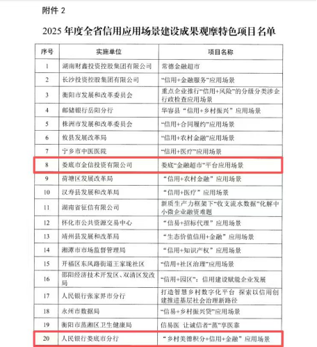 近日,湖南省健全社会信用体系联席会议办公室公布2025年度全省信用应用场景建设成果观摩活动结果,经过2轮专家评审和综合审议,娄底市金信投资有限公司的“娄底‘金融超市’平台应用场景”与中国人民银行娄底市分行的“‘乡村美德积分+信用+金融’应用场景”成功入选特色项目名单,彰显了娄底市在信用体系建设与惠民便企实践中的突出成效。