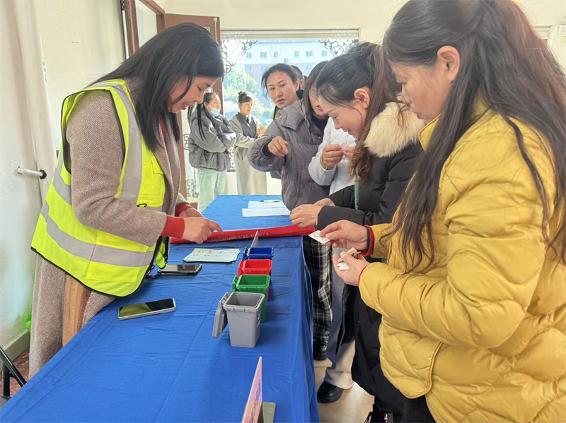 在“垃圾投掷沙包战”区域,居民们热情高涨,纷纷拿起标有不同垃圾名称的沙包,瞄准对应的分类桶投掷,每投中一次,现场就响起一阵欢呼,旁边的志愿者还会及时讲解该垃圾的分类要点;“垃圾分类猜猜猜”环节则充满了悬念,工作人员展示各类物品图片,参与者争相举手抢答,答错的人会认真倾听正确答案,答对的人则满脸自豪地分享自己的分类心得;“垃圾分类飞行棋”更是将游戏与知识深度结合,参与者根据掷出的骰子数字前进,途中会遇到各种垃圾分类问题,只有回答正确才能继续前行,大家在棋盘上你追我赶,时不时为彼此的精彩回答鼓掌,现场气氛既紧张又欢乐,原本枯燥的分类知识在游戏中变得生动易懂,居民们在轻松的氛围中不仅收获了乐趣,更将垃圾分类的理念深深印在了脑海里。