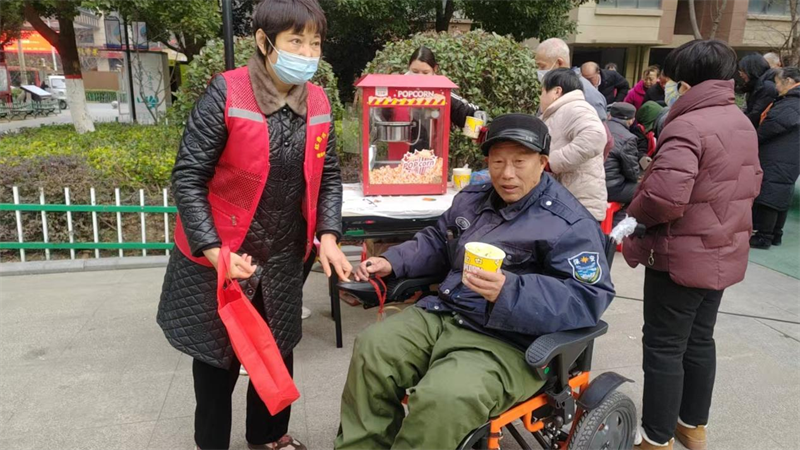 趣味游园专区里,夹球跳圈、沙包掷准两大游戏关卡前人头攒动,欢声笑语不断。党员志愿者陪同“窗帘之约”服务对象参与游戏,手把手指导他们掌握游戏技巧。夹球跳圈时细心搀扶、提醒脚下安全,沙包掷准现场则调整参与位置、讲解投掷要领,让行动不便的服务对象也能轻松体验游戏乐趣。完成两项游戏后,党员志愿者将爆米花送到“窗帘之约”服务对象手中,让他们在感受欢乐的同时,也能品尝到暖心美味。