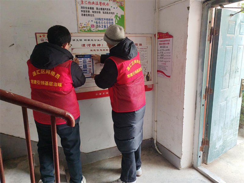 工作人员在楼道内和社区服务中心外墙上认真张贴反诈宣传公告,规范张贴位置,确保信息清晰醒目,方便居民阅读了解,进一步延伸宣传触角,打通反诈宣传“最后一米”。