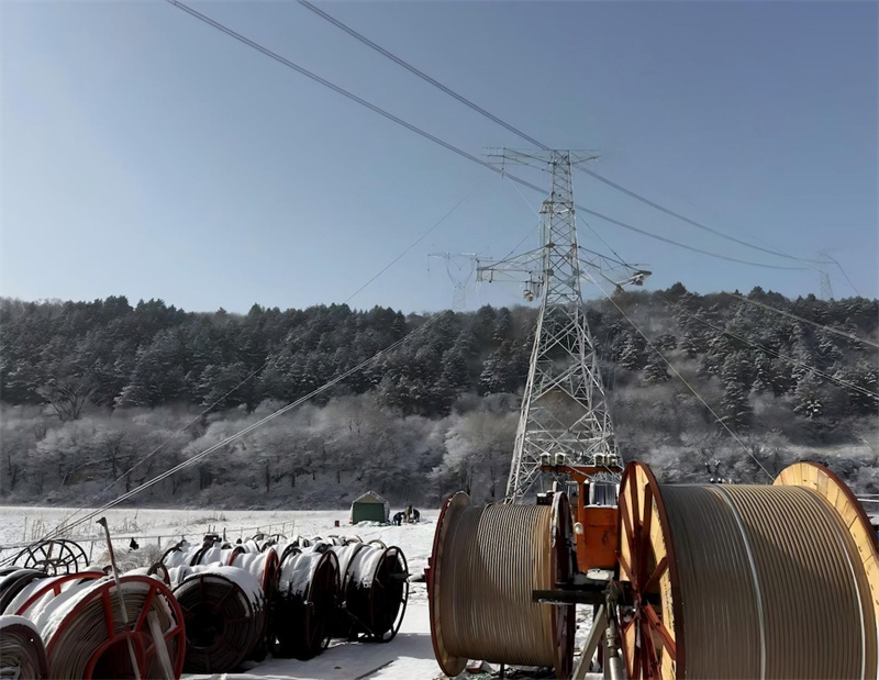 进入冬季,工程正值最后三档导线展放的紧张冲刺阶段,延安地区迎来了强降雪天气,气温骤降至零下二十摄氏度,强化人员保暖保障与维护设备正常运行成为重中之重。项目部为施工人员配备专业防寒装备,在各施工区域周边搭建临时暖棚,为人员轮换休息、设备临时保温提供便利。此外,项目部科学优化施工作息安排,全力避开极端低温时段,将核心工序安排在气温相对适宜的午间时段集中推进,同时保障施工人员身体健康和施工节奏稳中有进。