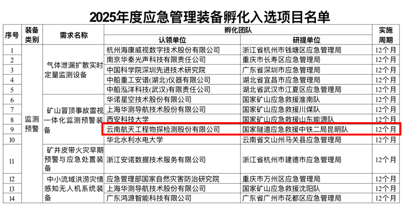 近日,应急管理部办公厅、工业和信息化部办公厅、国务院国资委办公厅联合公布2025年度应急管理装备孵化入选项目名单,云南航天工程物探检测股份有限公司(以下简称“云南航天检测”)研发的“矿山冒顶雷视一体化监测预警装备”成功入选,成为云南省3个入选项目之一,标志着公司在工程安全应急装备领域的技术实力获得国家层面认可。
