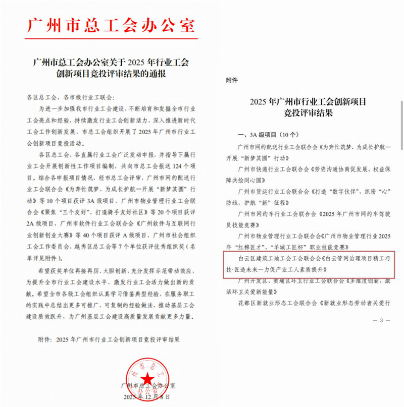 中化学南方建设投资(广东)有限公司(以下简称广东公司)所属白云管网治理工程项目在广东公司工会的正确带领下,充分发挥项目群团组织作用,申报的《白云管网治理项目精工巧技・匠造未来——力促产业工人素质提升》项目,荣获广州市总工会2025年行业工会3A级创新项目荣誉称号,标志着项目在产业工人队伍建设与工程创新管理领域的突出成效获得权威认可。