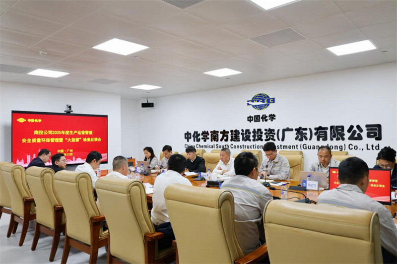 近日,中化学南方建设投资有限公司(以下简称南投公司)党委委员、副总经理、总工程师、安全总监张世华带队到中化学南方建设投资(广东)有限公司(以下简称广东公司)及所属项目开展2025年度生产运营管理、安全质量环保管理暨“大监督”检查。在召开检查反馈会上,南投公司安全生产监督管理部(质量环保监督管理部)部长薛陆豹主持会议,广东公司党总支副书记、总经理刘铁军做工作汇报。