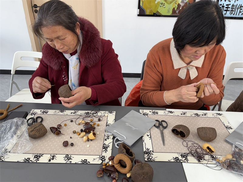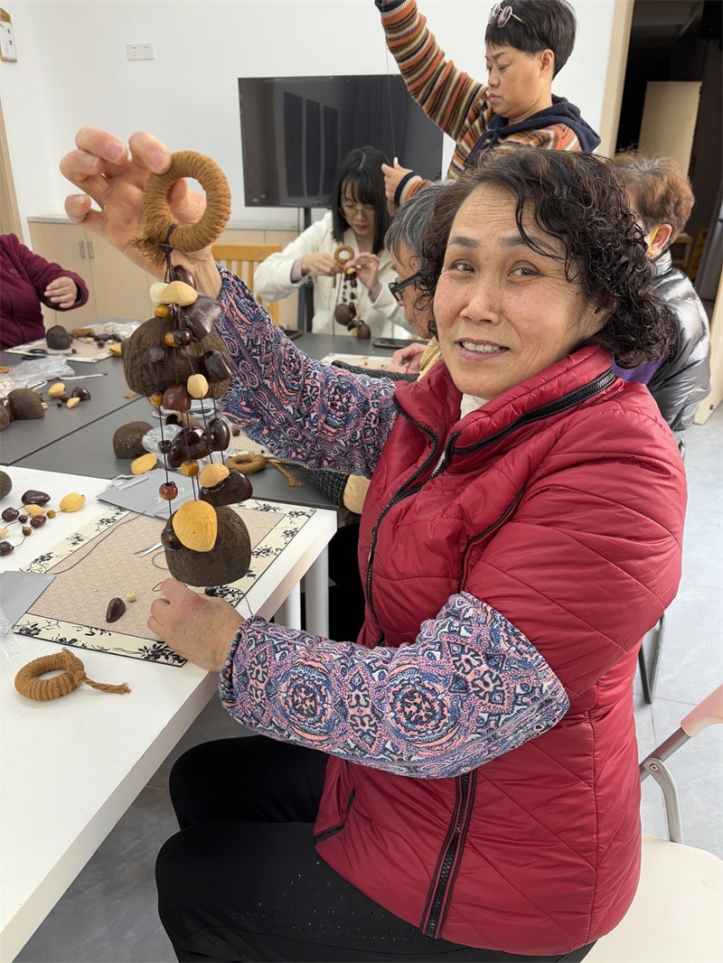 居民们听得认真、做得投入。大家小心翼翼地给果壳穿绳打结,将不同形状的果壳搭配组合,还不忘在风铃上系上写有祝福的红丝带。“平时吃坚果都是直接丢壳,没想到还能做成这么别致的风铃,挂在家里又好看又有意义,还能给孩子普及环保知识。”参加活动的王晓丽阿姨笑着说。